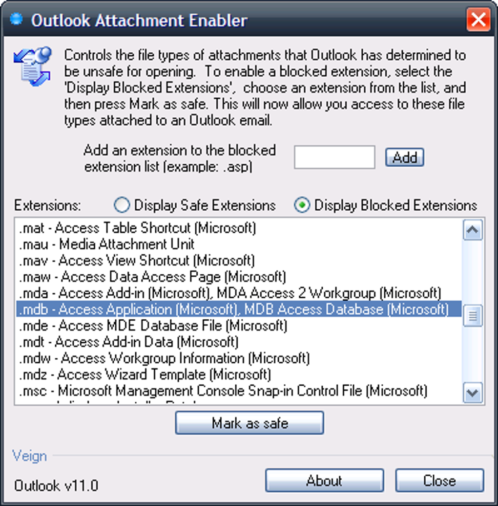 São duas opções para aumentar a segurança no Outlook Attachment Enabler. Se você clica em Display Safe Extensions, aparecem os arquivos permitidos. Por outro lado, a casa Display Blocked Extensions mostra a lista de bloqueados. Para configurar cada uma delas você clica em Add e retira ou acrescenta extensões.